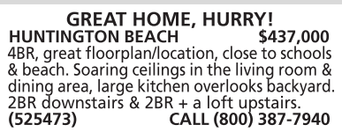 GREAT HOME, HURRY! HUNTINGTON BEACH $437,000 4BR, great floorplan/location, close to schools & beach. Soaring ceilings in the living room & dining area, large kitchen overlooks backyard. 2BR downstairs & 2BR + a loft upstairs. (525473) CALL (800) 387-7940