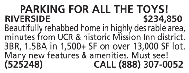 (525456) CALL (800) 387-7922 PARKING FOR ALL THE TOYS! RIVERSIDE $234,850 Beautifully rehabbed home in highly desirable area, minutes from UCR & historic Mission Inn district. 3BR, 1.5BA in 1,500+ SF on over 13,000 SF lot. Many new features & amenities. Must see! (525248) CALL (888) 307-0052