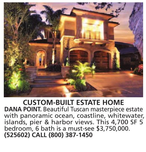 CUSTOM-BUILT ESTATE HOME DANA POINT. Beautiful Tuscan masterpiece estate with panoramic ocean, coastline, whitewater, islands, pier & harbor views. This 4,700 SF 5 bedroom, 6 bath is a must-see $3,750,000. (525602) CALL (800) 387-1450