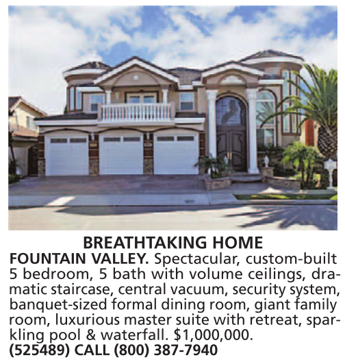whitewater, BREATHTAKING HOME FOUNTAIN VALLEY. Spectacular, custom-built 5 bedroom, 5 bath with volume ceilings, dramatic staircase, central vacuum, security system, banquet-sized formal dining room, giant family room, luxurious master suite with retreat, sparkling pool & waterfall. $1,000,000. (525489) CALL (800) 387-7940