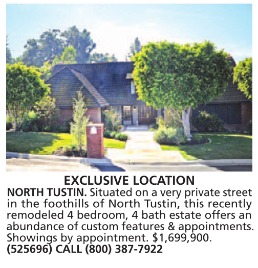 EXCLUSIVE LOCATION NORTH TUSTIN. Situated on a very private street in the foothills of North Tustin, this recently remodeled 4 bedroom, 4 bath estate offers an abundance of custom features & appointments. Showings by appointment. $1,699,900. (525696) CALL (800) 387-7922