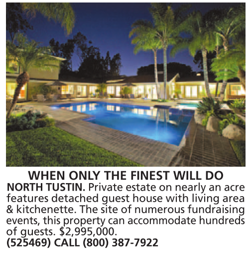 WHEN ONLY THE FINEST WILL DO NORTH TUSTIN. Private estate on nearly an acre features detached guest house with living area & kitchenette. The site of numerous fundraising events, this property can accommodate hundreds of guests. $2,995,000. (525469) CALL (800) 387-7922