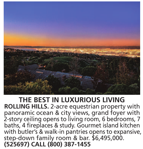 THE BEST IN LUXURIOUS LIVING ROLLING HILLS. 2-acre equestrian property with panoramic ocean & city views, grand foyer with 2-story ceiling opens to living room, 6 bedrooms, 7 baths, 4 fireplaces & study. Gourmet island kitchen with butler’s & walk-in pantries opens to expansive, step-down family room & bar. $6,495,000. (525697) CALL (800) 387-1455