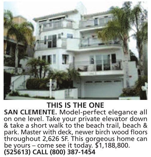 THIS IS THE ONE SAN CLEMENTE. Model-perfect elegance all on one level. Take your private elevator down & take a short walk to the beach trail, beach & park. Master with deck, newer birch wood floors throughout 2,626 SF. This gorgeous home can be yours – come see it today. $1,188,800. (525613) CALL (800) 387-1454