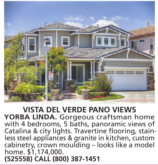 VISTA DEL VERDE PANO VIEWS YORBA LINDA. Gorgeous craftsman home with 4 bedrooms, 5 baths, panoramic views of Catalina & city lights. Travertine flooring, stainless steel appliances & granite in kitchen, custom cabinetry, crown moulding – looks like a model home. $1,174,000. (525558) CALL (800) 387-1451
