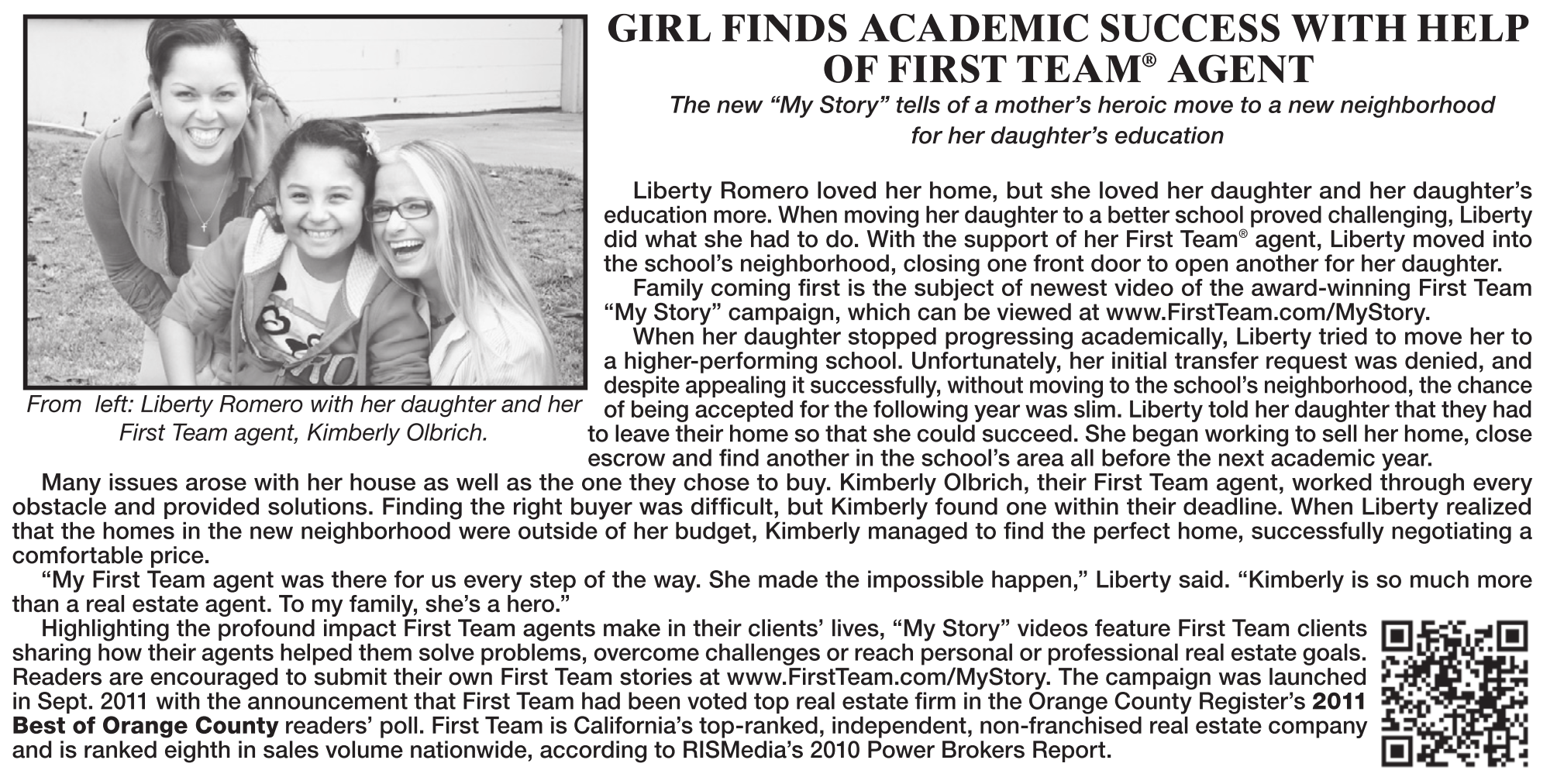 Highlighting the profound impact First Team agents make in their clients’ lives, “My Story” videos feature First Team clients sharing how their agents helped them solve problems, overcome challenges or reach personal or professional real estate goals. Readers are encouraged to submit their own First Team stories at www.FirstTeam.com/MyStory. The campaign was launched in Sept. 2011 with the announcement that First Team had been voted top real estate firm in the Orange County Register’s 2011 Best of Orange County readers’ poll. First Team is California’s top-ranked, independent, non-franchised real estate company and is ranked eighth in sales volume nationwide, according to RISMedia’s 2010 Power Brokers Report.