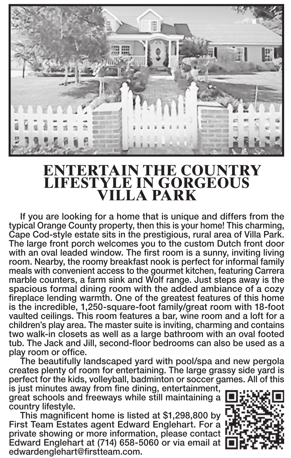 ENTERTAIN THE COUNTRY LIFESTYLE IN GORGEOUS VILLA PARK If you are looking for a home that is unique and differs from the typical Orange County property, then this is your home! This charming, Cape Cod-style estate sits in the prestigious, rural area of Villa Park. The large front porch welcomes you to the custom Dutch front door with an oval leaded window. The first room is a sunny, inviting living room. Nearby, the roomy breakfast nook is perfect for informal family meals with convenient access to the gourmet kitchen, featuring Carrera marble counters, a farm sink and Wolf range. Just steps away is the spacious formal dining room with the added ambiance of a cozy fireplace lending warmth. One of the greatest features of this home is the incredible, 1,250-square-foot family/great room with 18-foot vaulted ceilings. This room features a bar, wine room and a loft for a children’s play area. The master suite is inviting, charming and contains two walk-in closets as well as a large bathroom with an oval footed tub. The Jack and Jill, second-floor bedrooms can also be used as a play room or office. The beautifully landscaped yard with pool/spa and new pergola creates plenty of room for entertaining. The large grassy side yard is perfect for the kids, volleyball, badminton or soccer games. All of this is just minutes away from fine dining, entertainment, great schools and freeways while still maintaining a country lifestyle. This magnificent home is listed at $1,298,800 by First Team Estates agent Edward Englehart. For a private showing or more information, please contact Edward Englehart at (714) 658-5060 or via email at edwardenglehart@firstteam.com.