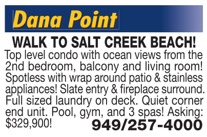 Dana Point WALK TO SALT CREEK BEACH! Top level condo with ocean views from the 2nd bedroom, balcony and living room! Spotless with wrap around patio & stainless appliances! Slate entry & fireplace surround. Full sized laundry on deck. Quiet corner end unit. Pool, gym, and 3 spas! Asking: $329,900! 949/257-4000