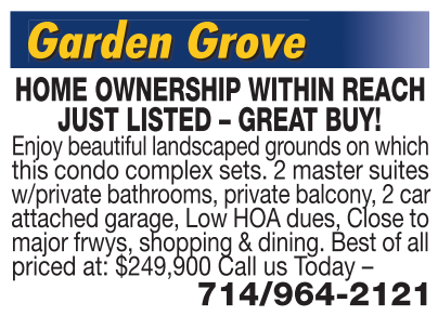 Enjoy beautiful landscaped grounds on which this condo complex sets. 2 master suites w/private bathrooms, private balcony, 2 car attached garage, Low HOA dues, Close to major frwys, shopping & dining. Best of all priced at: $249,900 Call us Today – 714/964-2121