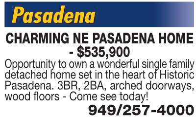CHARMING NE PASADENA HOME - $535,900 Opportunity to own a wonderful single family detached home set in the heart of Historic Pasadena. 3BR, 2BA, arched doorways, wood floors - Come see today!