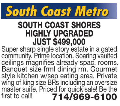 SOUTH COAST SHORES HIGHLY UPGRADED JUST $499,000 Super sharp single story estate in a gated community. Prime location. Soaring vaulted ceilings magnifies already spac. rooms. Banquet size frml dining rm. Gourmet style kitchen w/sep eating area. Private wing of king size BRs including an oversize master suite. Priced for quick sale! Be the first to call! 714/969-6100