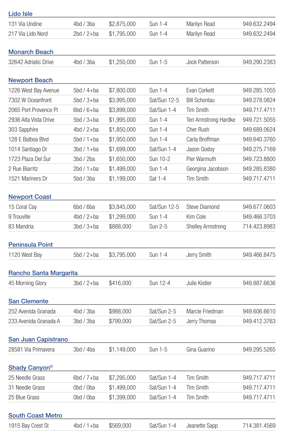 Newport Coast 15 Coral Cay 6bd / 6ba $3,845,000 Sat/Sun 12-5 Steve Diamond 949.677.0603 9 Trouville 4bd / 2+ba $1,299,000 Sun 1-4 Kim Cole 949.466.3703 83 Mandria 3bd / 3+ba $888,000 Sun 2-5 Shelley Armstrong 714.423.8983