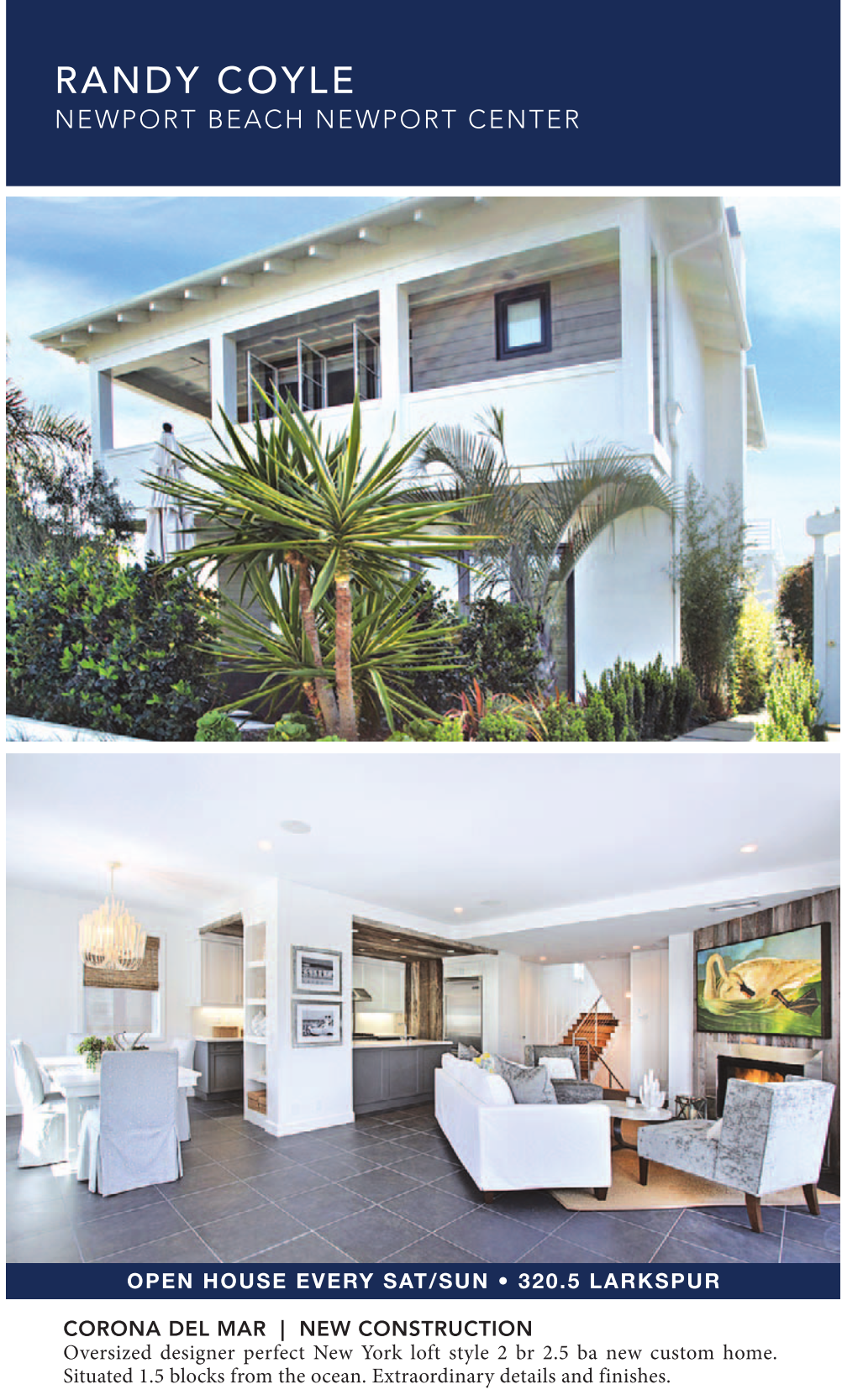 RANDY COYLE NEWPORT BEACH NEWPORT CENTER OPEN HOUSE EVERY SAT/SUN • 320.5 LARKSPUR CORONA DEL MAR | NEW CONSTRUCTION Oversized designer perfect New York loft style 2 br 2.5 ba new custom home. Situated 1.5 blocks from the ocean. Extraordinary details and finishes.