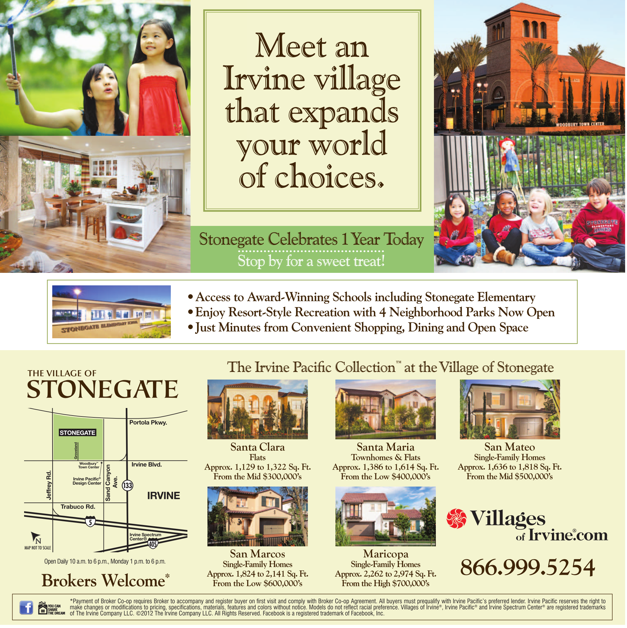 *Payment of Broker Co-op requires Broker to accompany and register buyer on first visit and comply with Broker Co-op Agreement. All buyers must prequalify with Irvine Pacific’s preferred lender. Irvine Pacific reserves the right to make changes or modifications to pricing, specifications, materials, features and colors without notice. Models do not reflect racial preference. Villages of Irvine ® , Irvine Pacific ® and Irvine Spectrum Center ® are registered trademarks of The Irvine Company LLC. ©2012 The Irvine Company LLC. All Rights Reserved. Facebook is a registered trademark of Facebook, Inc.