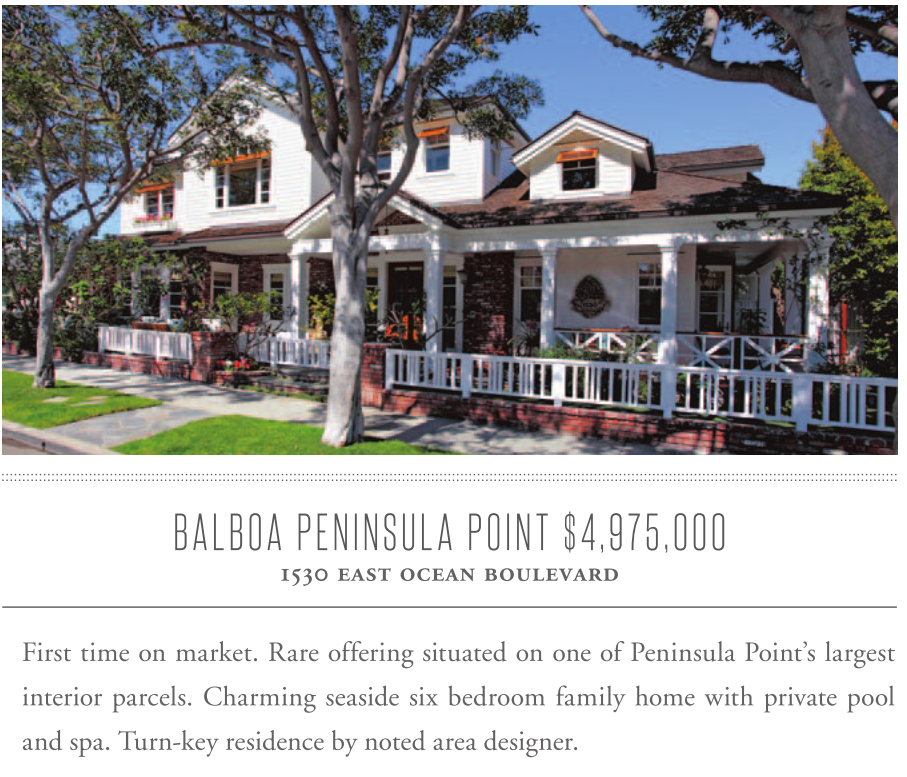 BALBOA PENINSULA POINT $4,975,000 1530 east ocean boulevard First time on market. Rare offering situated on one of Peninsula Point’s largest interior parcels. Charming seaside six bedroom family home with private pool and spa. Turn-key residence by noted area designer.