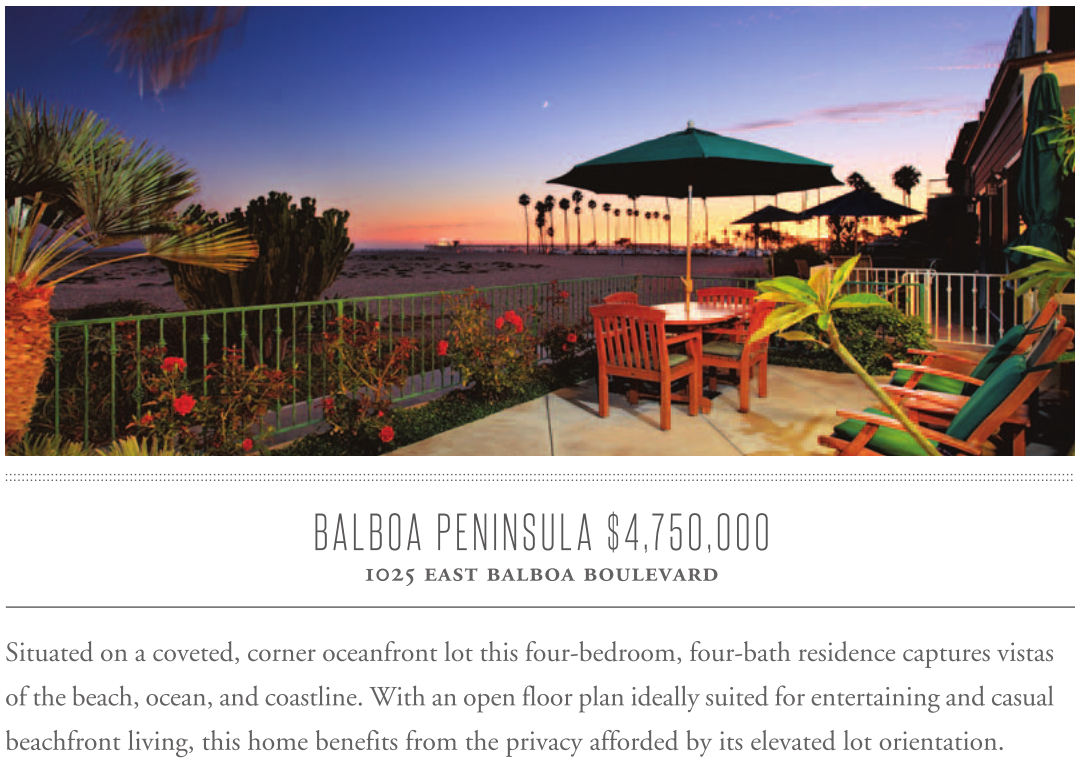 BALBOA PENINSULA $4,750,000 1025 east balboa boulevard Situated on a coveted, corner oceanfront lot this four-bedroom, four-bath residence captures vistas of the beach, ocean, and coastline. With an open floor plan ideally suited for entertaining and casual beachfront living, this home benefits from the privacy afforded by its elevated lot orientation.