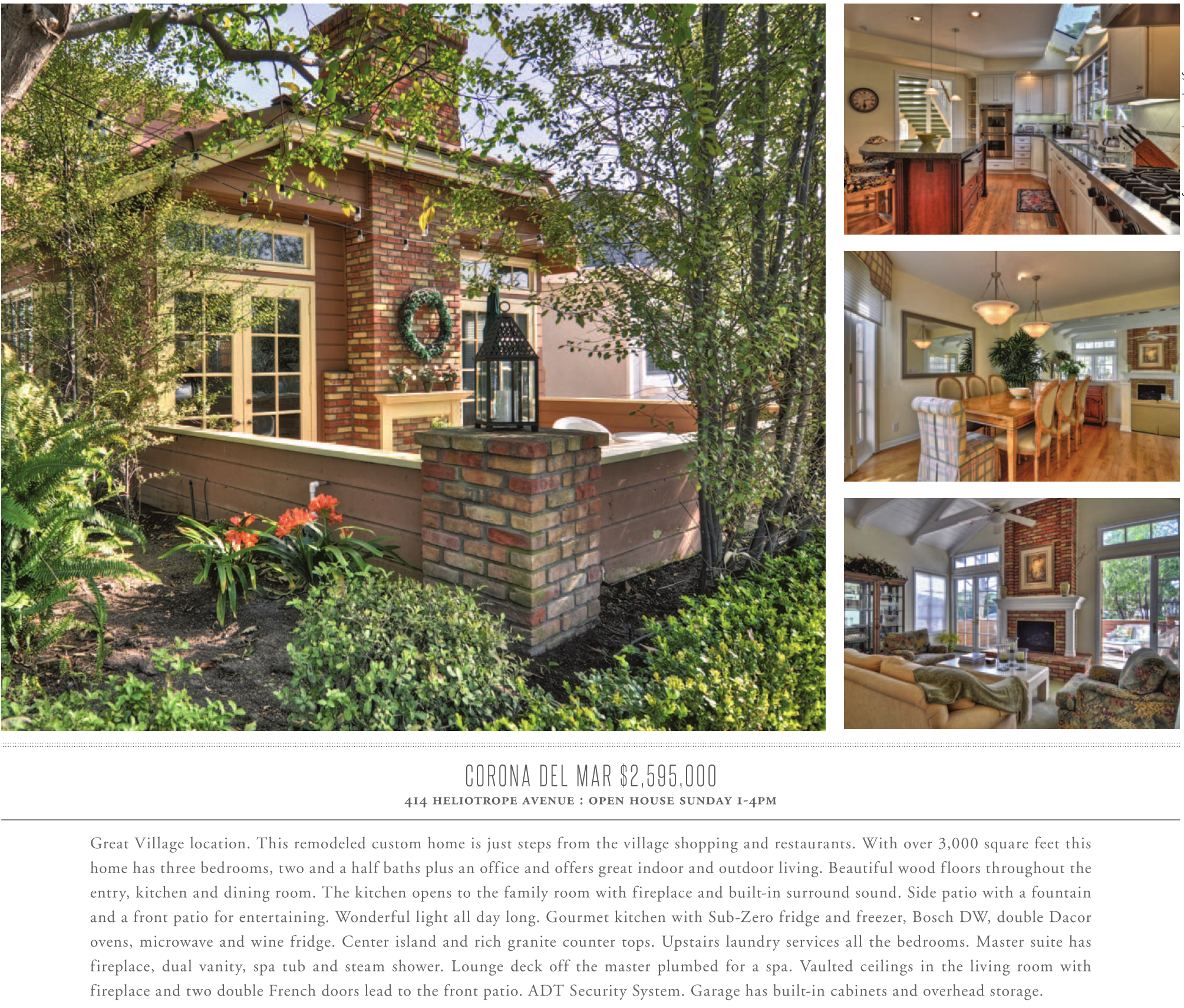 CORONA DEL MAR $2,595,000 414 heliotrope avenue : open house sunday 1-4pm Great Village location. This remodeled custom home is just steps from the village shopping and restaurants. With over 3,000 square feet this home has three bedrooms, two and a half baths plus an office and offers great indoor and outdoor living. Beautiful wood floors throughout the entry, kitchen and dining room. The kitchen opens to the family room with fireplace and built-in surround sound. Side patio with a fountain and a front patio for entertaining. Wonderful light all day long. Gourmet kitchen with Sub-Zero fridge and freezer, Bosch DW, double Dacor ovens, microwave and wine fridge. Center island and rich granite counter tops. Upstairs laundry services all the bedrooms. Master suite has fireplace, dual vanity, spa tub and steam shower. Lounge deck off the master plumbed for a spa. Vaulted ceilings in the living room with fireplace and two double French doors lead to the front patio. ADT Security System. Garage has built-in cabinets and overhead storage.