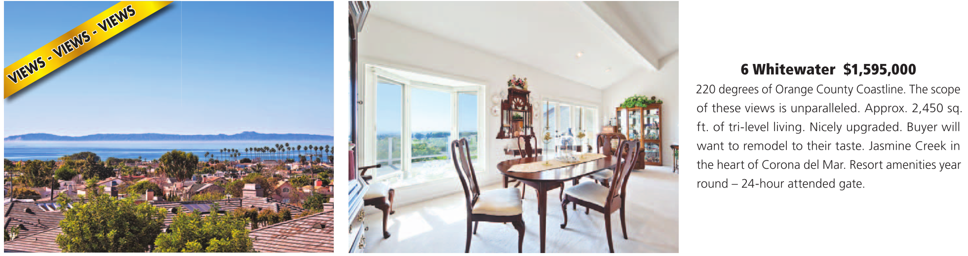 6 Whitewater $1,595,000 220 degrees of Orange County Coastline. The scope of these views is unparalleled. Approx. 2,450 sq. ft. of tri-level living. Nicely upgraded. Buyer will want to remodel to their taste. Jasmine Creek in the heart of Corona del Mar. Resort amenities year round – 24-hour attended gate.
