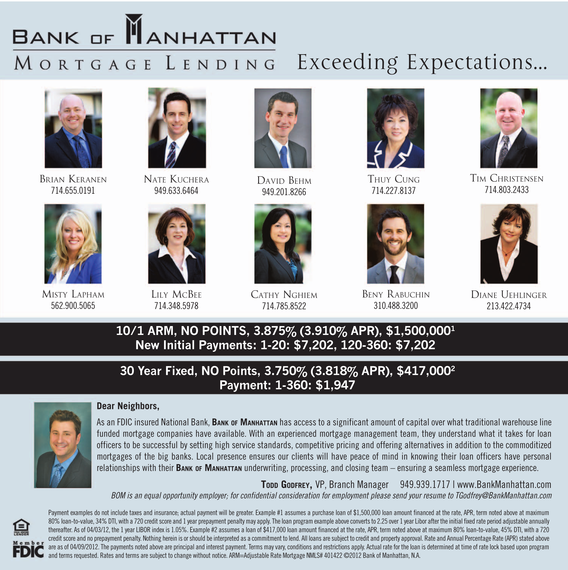 Dear Neighbors, As an FDIC insured National Bank, BANK OF MANHATTAN has access to a significant amount of capital over what traditional warehouse line funded mortgage companies have available. With an experienced mortgage management team, they understand what it takes for loan officers to be successful by setting high service standards, competitive pricing and offering alternatives in addition to the commoditized mortgages of the big banks. Local presence ensures our clients will have peace of mind in knowing their loan officers have personal relationships with their BANK OF MANHATTAN underwriting, processing, and closing team – ensuring a seamless mortgage experience.