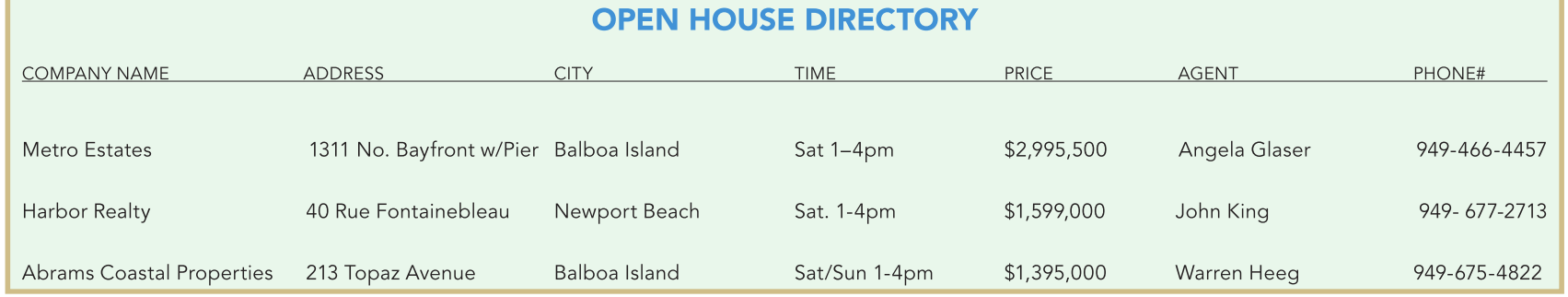 OPEN HOUSE DIRECTORY COMPANY NAME ADDRESS CITY TIME PRICE AGENT PHONE# Metro Estates 1311 No. Bayfront w/Pier Balboa Island Sat 1–4pm $2,995,500 Angela Glaser 949-466-4457 Harbor Realty 40 Rue Fontainebleau Newport Beach Sat. 1-4pm $1,599,000 John King 949- 677-2713 Abrams Coastal Properties 213 Topaz Avenue Balboa Island Sat/Sun 1-4pm $1,395,000 Warren Heeg 949-675-4822