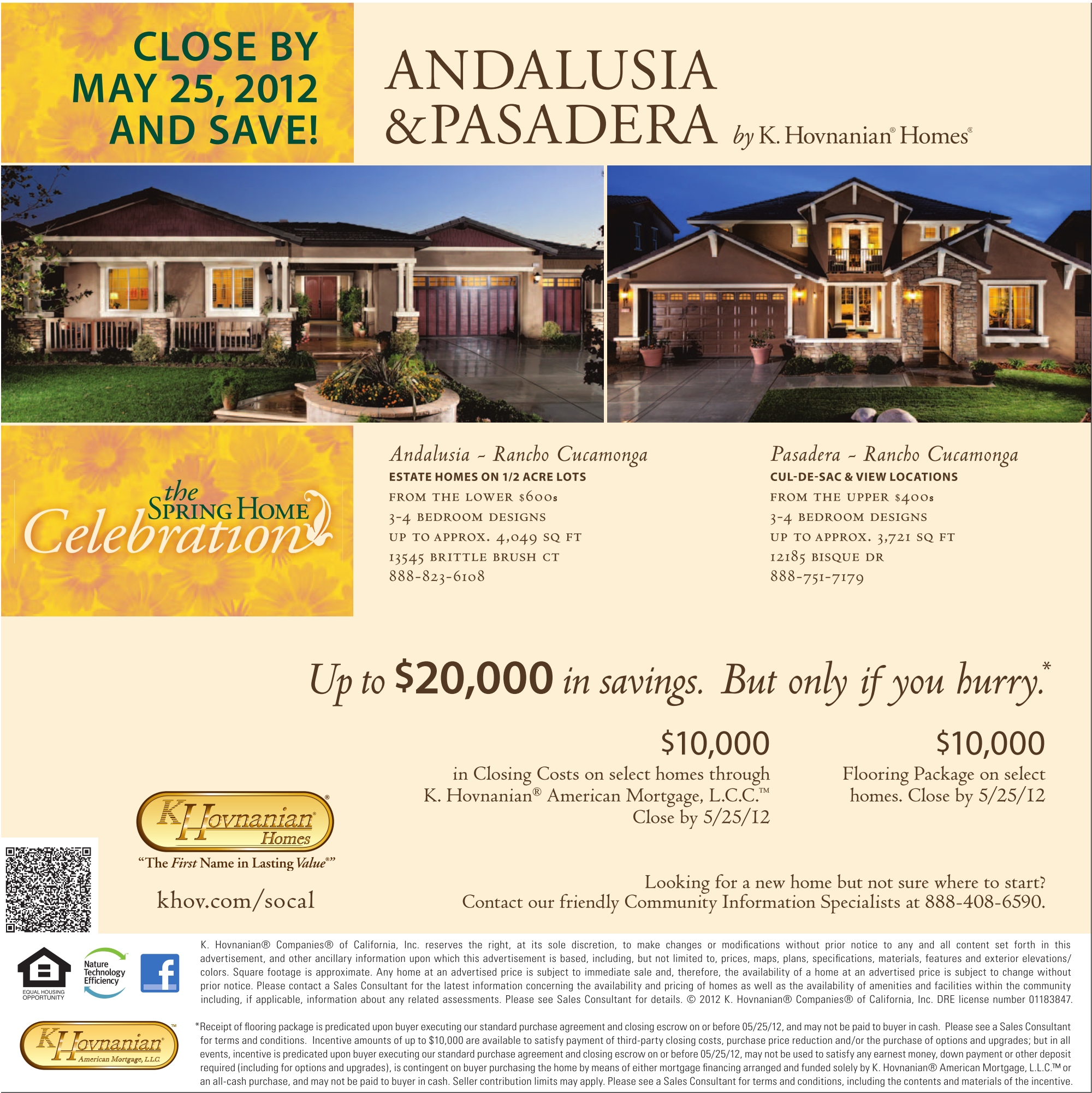 K. Hovnanian® Companies® of California, Inc. reserves the right, at its sole discretion, to make changes or modifications without prior notice to any and all content set forth in this advertisement, and other ancillary information upon which this advertisement is based, including, but not limited to, prices, maps, plans, specifications, materials, features and exterior elevations/ colors. Square footage is approximate. Any home at an advertised price is subject to immediate sale and, therefore, the availability of a home at an advertised price is subject to change without prior notice. Please contact a Sales Consultant for the latest information concerning the availability and pricing of homes as well as the availability of amenities and facilities within the community including, if applicable, information about any related assessments. Please see Sales Consultant for details. © 2012 K. Hovnanian® Companies® of California, Inc. DRE license number 01183847.