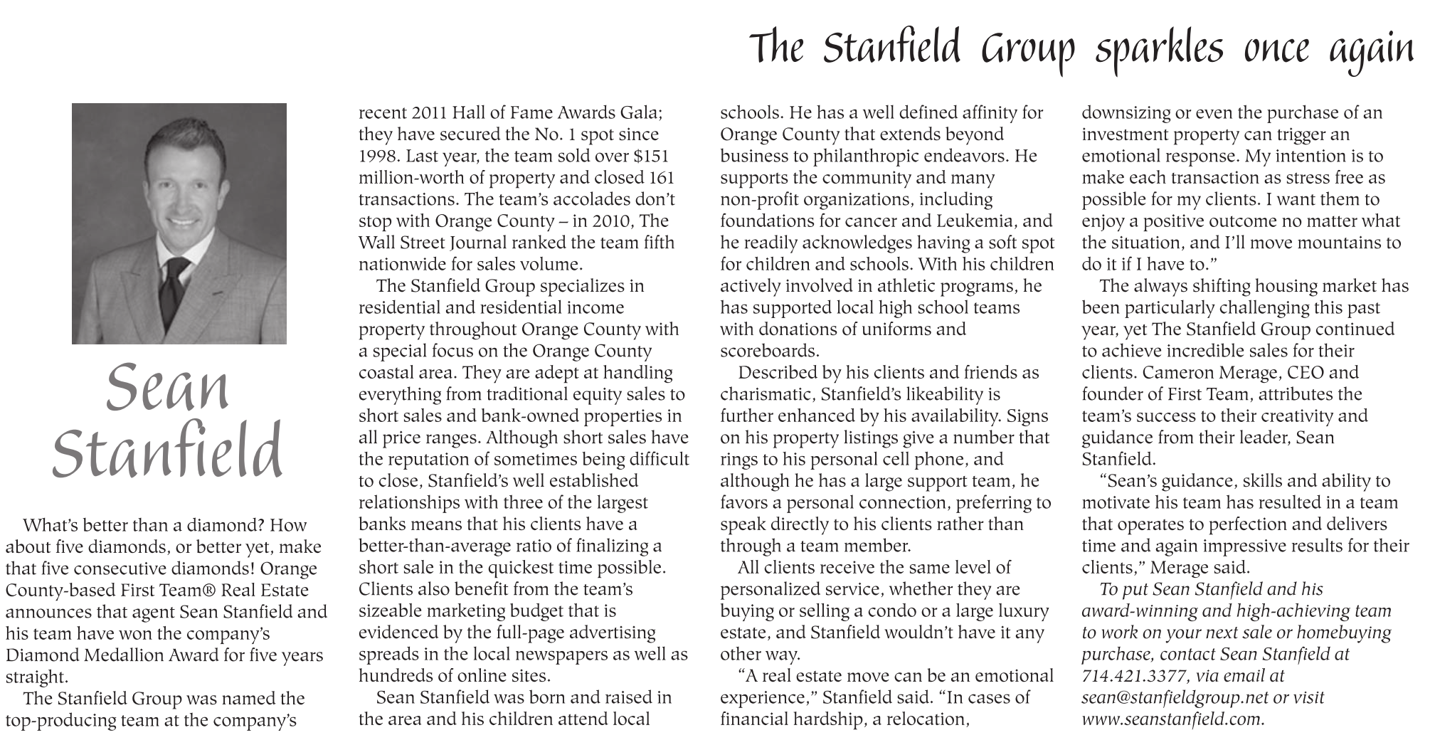 To put Sean Stanfield and his award-winning and high-achieving team to work on your next sale or homebuying purchase, contact Sean Stanfield at 714.421.3377, via email at sean@stanfieldgroup.net or visit www.seanstanfield.com.