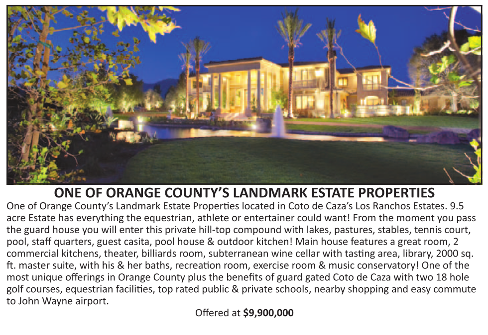 ONE OF ORANGE COUNTY’S LANDMARK ESTATE PROPERTIES One of Orange County’s Landmark Estate Proper es located in Coto de Caza’s Los Ranchos Estates. 9.5 acre Estate has everything the equestrian, athlete or entertainer could want! From the moment you pass the guard house you will enter this private hill-top compound with lakes, pastures, stables, tennis court, pool, staff quarters, guest casita, pool house & outdoor kitchen! Main house features a great room, 2 commercial kitchens, theater, billiards room, subterranean wine cellar with tas ng area, library, 2000 sq. . master suite, with his & her baths, recrea on room, exercise room & music conservatory! One of the most unique offerings in Orange County plus the benefits of guard gated Coto de Caza with two 18 hole golf courses, equestrian facili es, top rated public & private schools, nearby shopping and easy commute to John Wayne airport. Offered at $9,900,000