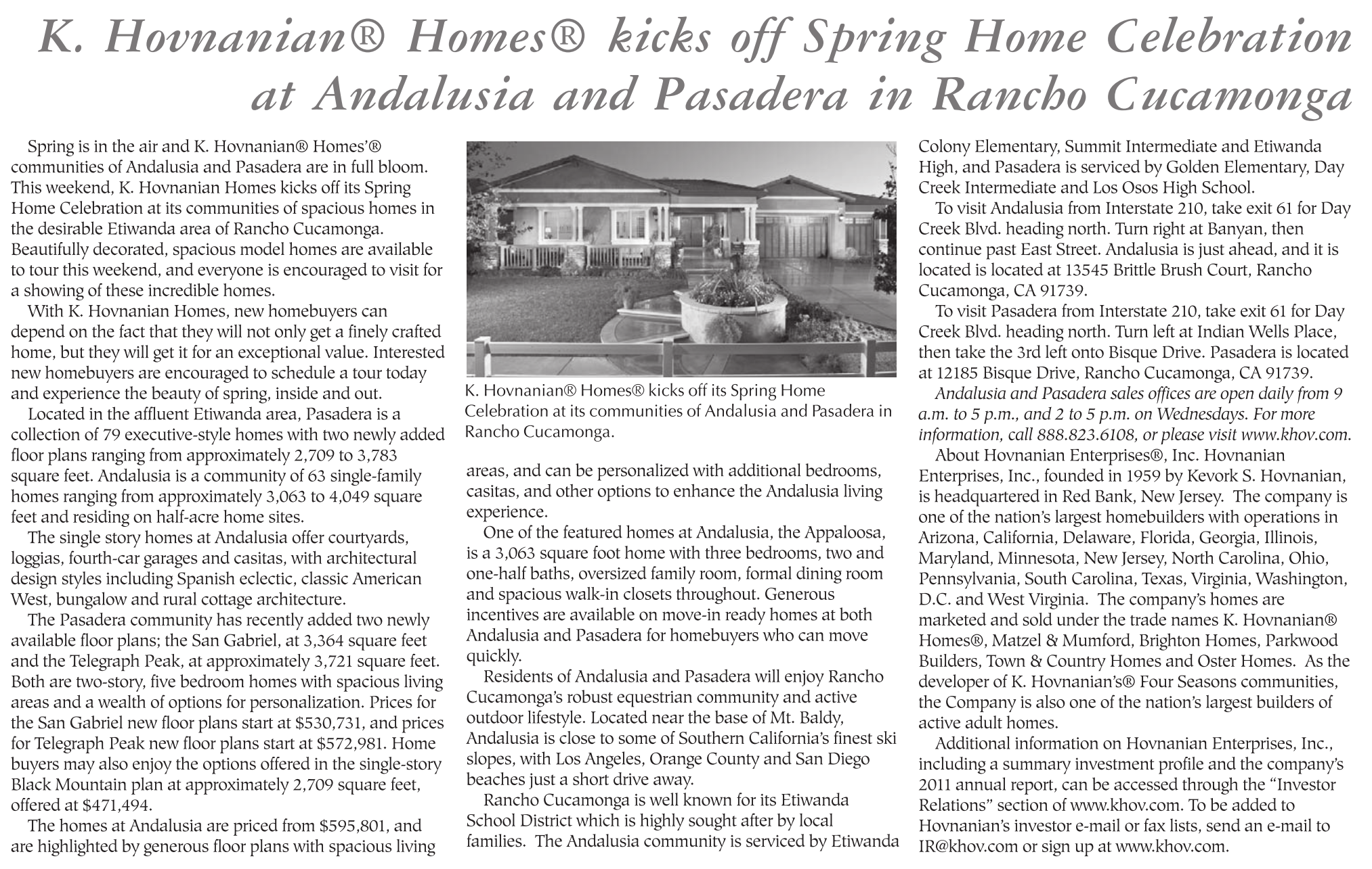 K. Hovnanian® Homes® kicks off Spring Home Celebration at Andalusia and Pasadera in Rancho Cucamonga