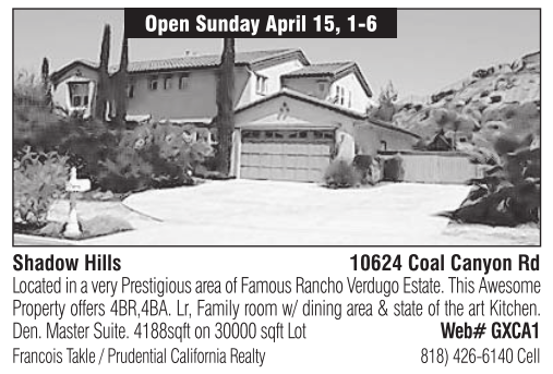 Open Sunday April 15, 1-6 Shadow Hills 10624 Coal Canyon Rd Located in a very Prestigious area of Famous Rancho Verdugo Estate. This Awesome Property offers 4BR,4BA. Lr, Family room w/ dining area & state of the art Kitchen. Den. Master Suite. 4188sqft on 30000 sqft Lot Web# GXCA1 Francois Takle / Prudential California Realty 818) 426-6140 Cell