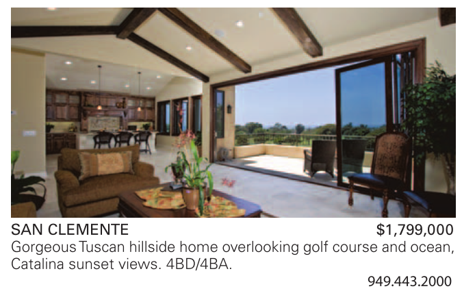 SAN CLEMENTE $1,799,000 Gorgeous Tuscan hillside home overlooking golf course and ocean, Catalina sunset views. 4BD/4BA.