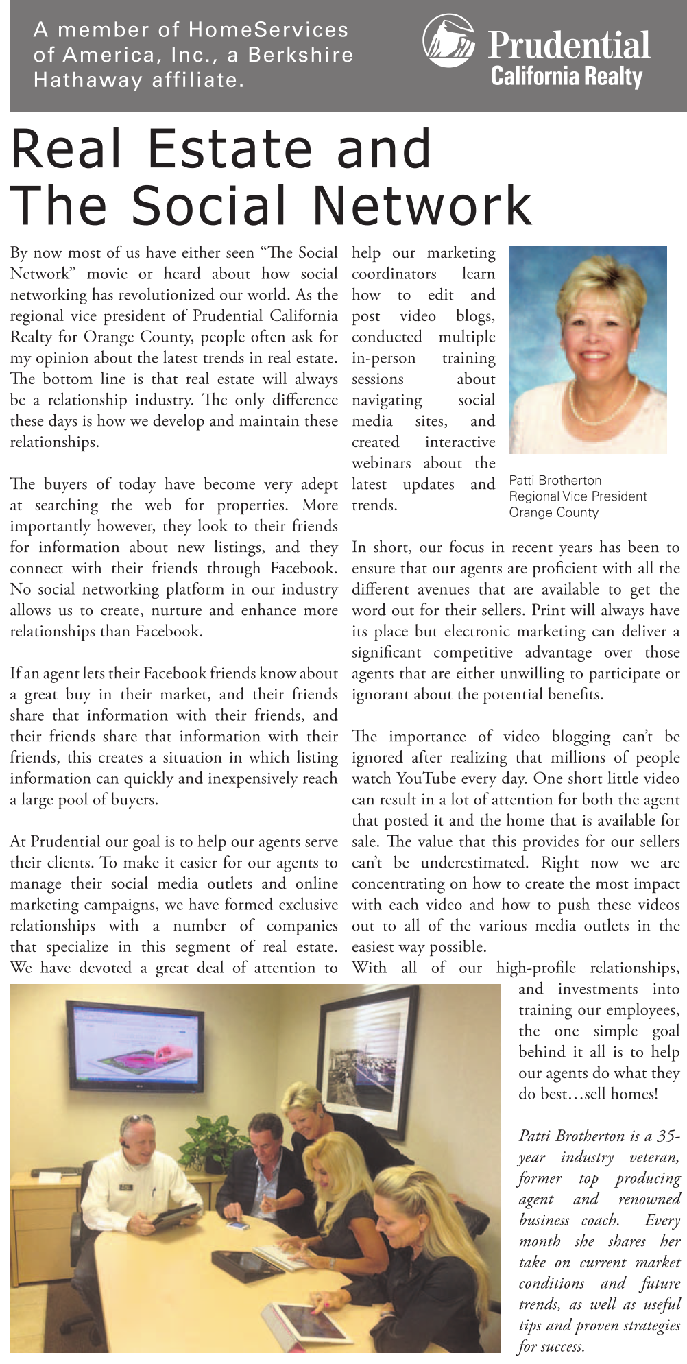 By now most of us have either seen “The Social Network” movie or heard about how social networking has revolutionized our world. As the regional vice president of Prudential California Realty for Orange County, people often ask for my opinion about the latest trends in real estate. The bottom line is that real estate will always be a relationship industry. The only difference these days is how we develop and maintain these relationships.