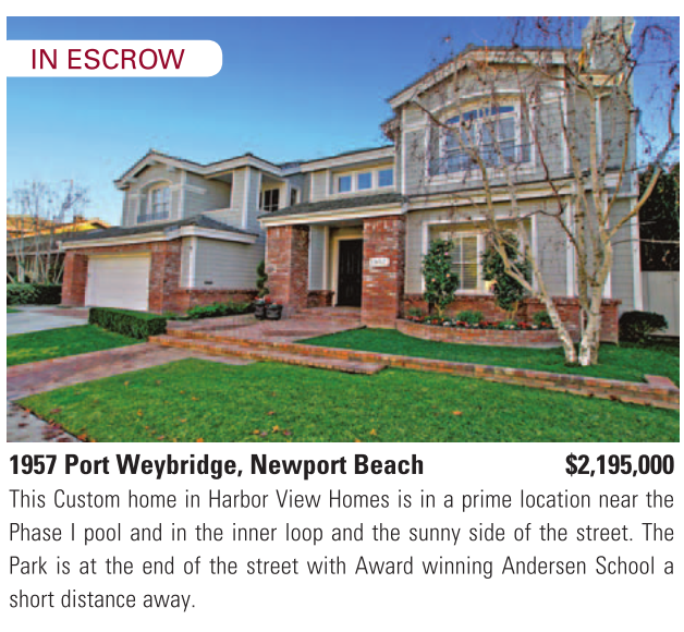 1957 Port Weybridge, Newport Beach $2,195,000 This Custom home in Harbor View Homes is in a prime location near the Phase I pool and in the inner loop and the sunny side of the street. The Park is at the end of the street with Award winning Andersen School a short distance away.
