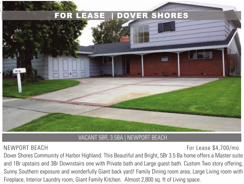 VACANT 5BR, 3.5BA | NEWPORT BEACH NEWPORT BEACH For Lease $4,700/mo Dover Shores Community of Harbor Highland. This Beautiful and Bright, 5Br 3.5 Ba home offers a Master suite and 1Br upstairs and 3Br Downstairs one with Private bath and Large guest bath. Custom Two story offering, Sunny Southern exposure and wonderfully Giant back yard! Family Dining room area, Large Living room with Fireplace, Interior Laundry room, Giant Family Kitchen. Almost 2,800 sq. ft of Living space.