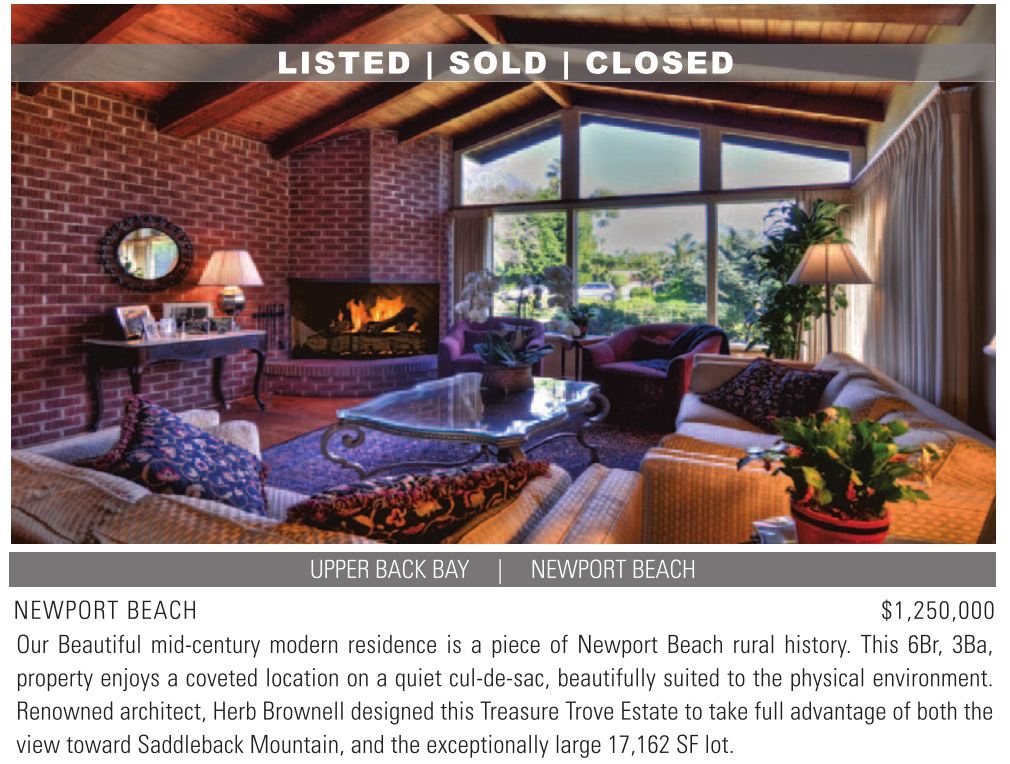 LISTED | SOLD | CLOSED UPPER BACK BAY | NEWPORT BEACH NEWPORT BEACH $1,250,000 Our Beautiful mid-century modern residence is a piece of Newport Beach rural history. This 6Br, 3Ba, property enjoys a coveted location on a quiet cul-de-sac, beautifully suited to the physical environment. Renowned architect, Herb Brownell designed this Treasure Trove Estate to take full advantage of both the view toward Saddleback Mountain, and the exceptionally large 17,162 SF lot. See also