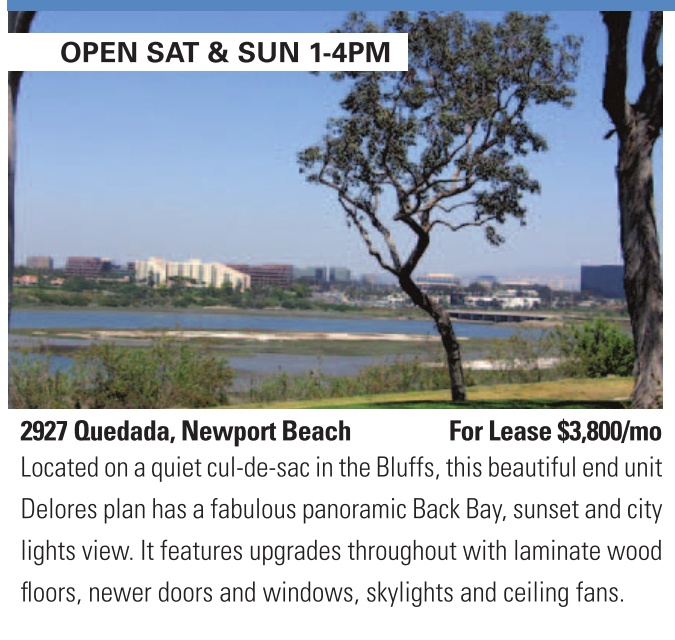 OPEN SAT & SUN 1-4PM 2927 Quedada, Newport Beach For Lease $3,800/mo Located on a quiet cul-de-sac in the Bluffs, this beautiful end unit Delores plan has a fabulous panoramic Back Bay, sunset and city lights view. It features upgrades throughout with laminate wood floors, newer doors and windows, skylights and ceiling fans. See also