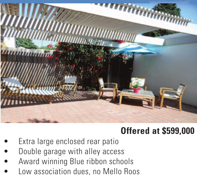 Offered at $599,000 • Extra large enclosed rear patio • Double garage with alley access • Award winning Blue ribbon schools • Low association dues, no Mello Roos