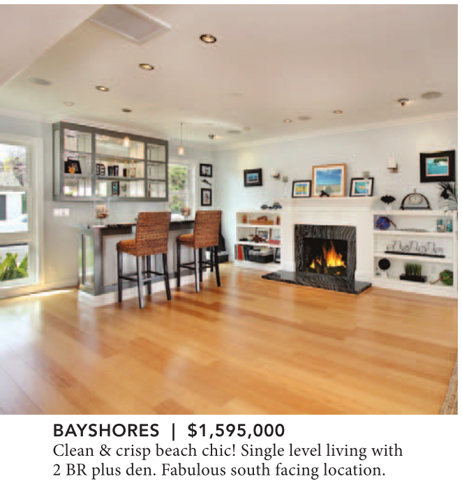 BAYSHORES | $1,595,000 Clean & crisp beach chic! Single level living with 2 BR plus den. Fabulous south facing location.
