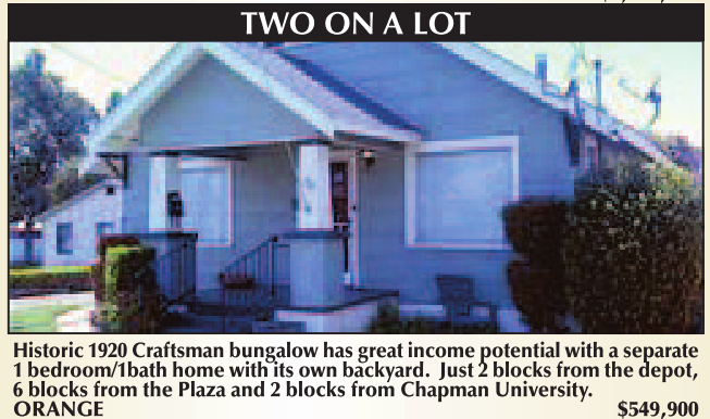 ORANGE $1,295,000 TWO ON A LOT Historic 1920 Craftsman bungalow has great income potential with a separate 1 bedroom/1bath home with its own backyard. Just 2 blocks from the depot, 6 blocks from the Plaza and 2 blocks from Chapman University. ORANGE $549,900
