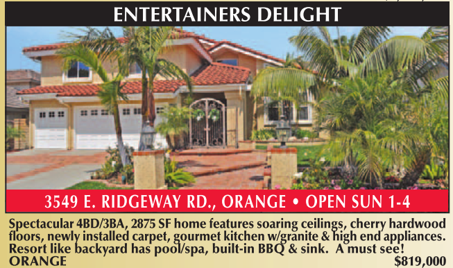 CORONA DEL MAR $1,425,000 ENTERTAINERS DELIGHT 3549 E. RIDGEWAY RD., ORANGE • OPEN SUN 1-4 Spectacular 4BD/3BA, 2875 SF home features soaring ceilings, cherry hardwood floors, newly installed carpet, gourmet kitchen w/granite & high end appliances. Resort like backyard has pool/spa, built-in BBQ & sink. A must see! ORANGE $819,000