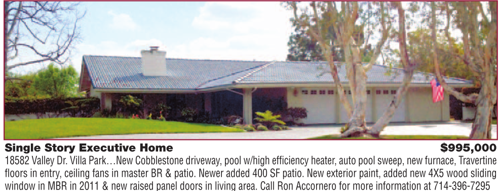 Single Story Executive Home $995,000 18582 Valley Dr. Villa Park…New Cobblestone driveway, pool w/high efficiency heater, auto pool sweep, new furnace, Travertine fl oors in entry, ceiling fans in master BR & patio. Newer added 400 SF patio. New exterior paint, added new 4X5 wood sliding window in MBR in 2011 & new raised panel doors in living area. Call Ron Accornero for more information at 714-396-7295