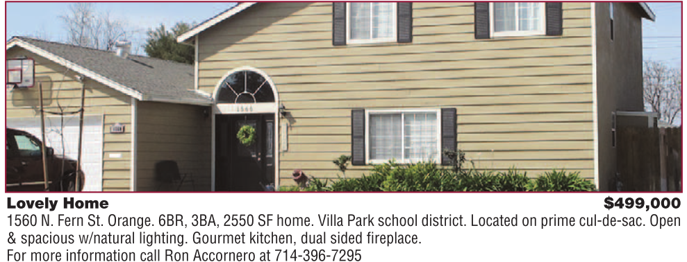 Lovely Home $499,000 1560 N. Fern St. Orange. 6BR, 3BA, 2550 SF home. Villa Park school district. Located on prime cul-de-sac. Open
