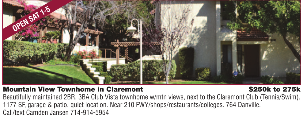 Mountain View Townhome in Claremont $250k to 275k Beautifully maintained 2BR, 3BA Club Vista townhome w/mtn views, next to the Claremont Club (Tennis/Swim). 1177 SF, garage & patio, quiet location. Near 210 FWY/shops/restaurants/colleges. 764 Danville. Call/text Camden Jansen 714-914-5954