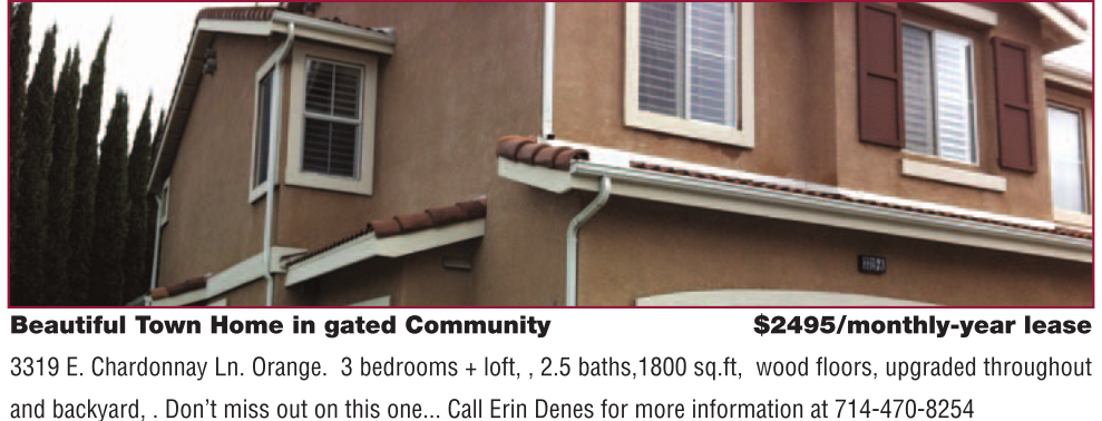 Beautiful Town Home in gated Community $2495/monthly-year lease 3319 E. Chardonnay Ln. Orange. 3 bedrooms + loft, , 2.5 baths,1800 sq.ft, wood fl oors, upgraded throughout and backyard, . Don’t miss out on this one... Call Erin Denes for more information at 714-470-8254