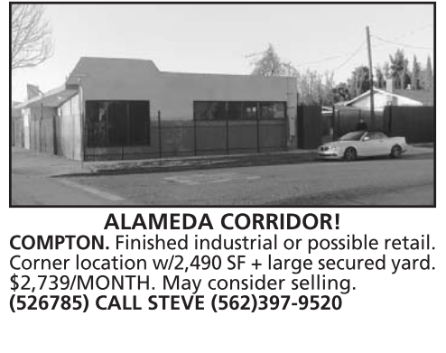 COMPTON. Finished industrial or possible retail. Corner location w/2,490 SF + large secured yard. $2,739/MONTH. May consider selling. (526785) CALL STEVE (562)397-9520