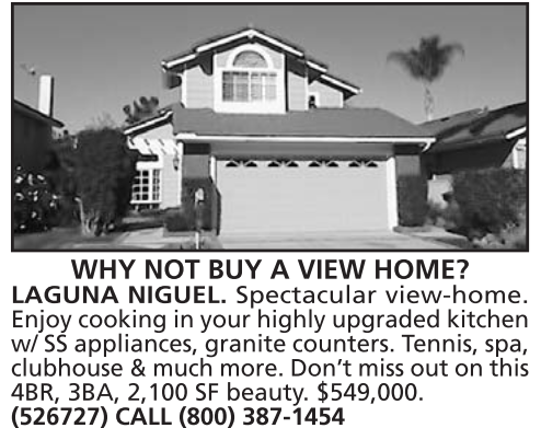LAGUNA NIGUEL. Spectacular view-home. Enjoy cooking in your highly upgraded kitchen w/ SS appliances, granite counters. Tennis, spa, clubhouse & much more. Don’t miss out on this 4BR, 3BA, 2,100 SF beauty. $549,000. (526727) CALL (800) 387-1454