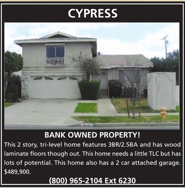 BANK OWNED PROPERTY! This 2 story, tri-level home features 3BR/2.5BA and has wood laminate floors though out. This home needs a little TLC but has lots of potential. This home also has a 2 car attached garage. $489,900. CYPRESS (800) 965-2104 Ext 6230