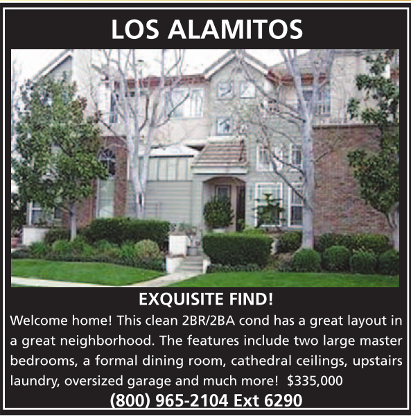 LOS ALAMITOS EXQUISITE FIND! Welcome home! This clean 2BR/2BA cond has a great layout in a great neighborhood. The features include two large master bedrooms, a formal dining room, cathedral ceilings, upstairs laundry, oversized garage and much more! $335,000 (800) 965-2104 Ext 6290
