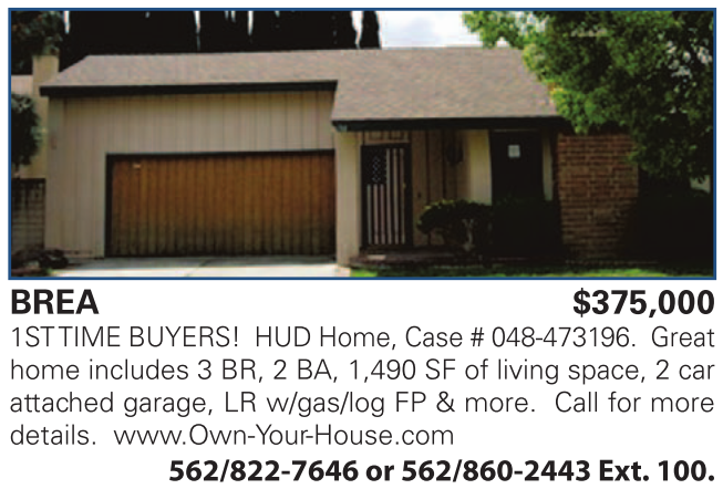 BREA $375,000 1ST TIME BUYERS! HUD Home, Case # 048-473196. Great home includes 3 BR, 2 BA, 1,490 SF of living space, 2 car attached garage, LR w/gas/log FP & more. Call for more details. www.Own-Your-House.com 562/822-7646 or 562/860-2443 Ext. 100.