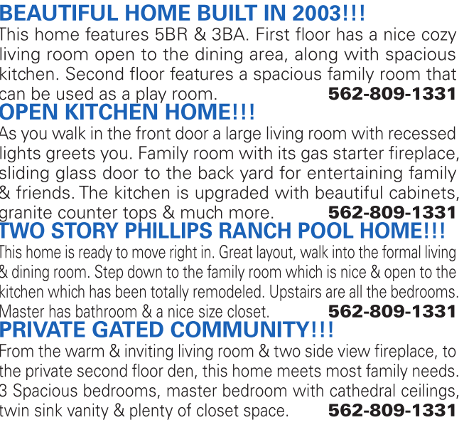 BEAUTIFUL HOME BUILT IN 2003!!! This home features 5BR & 3BA. First floor has a nice cozy living room open to the dining area, along with spacious kitchen. Second floor features a spacious family room that can be used as a play room. 562-809-1331 OPEN KITCHEN HOME!!! As you walk in the front door a large living room with recessed lights greets you. Family room with its gas starter fireplace, sliding glass door to the back yard for entertaining family & friends. The kitchen is upgraded with beautiful cabinets, granite counter tops & much more. 562-809-1331 TWO STORY PHILLIPS RANCH POOL HOME!!! This home is ready to move right in. Great layout, walk into the formal living & dining room. Step down to the family room which is nice & open to the kitchen which has been totally remodeled. Upstairs are all the bedrooms. Master has bathroom & a nice size closet. 562-809-1331 PRIVATE GATED COMMUNITY!!! From the warm & inviting living room & two side view fireplace, to the private second floor den, this home meets most family needs. 3 Spacious bedrooms, master bedroom with cathedral ceilings, twin sink vanity & plenty of closet space. 562-809-1331