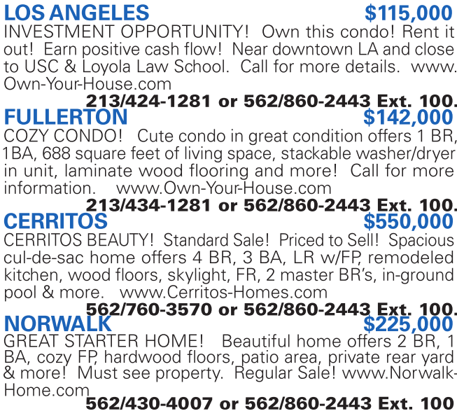 LOS ANGELES $115,000 INVESTMENT OPPORTUNITY! Own this condo! Rent it out! Earn positive cash flow! Near downtown LA and close to USC & Loyola Law School. Call for more details. www. Own-Your-House.com 213/424-1281 or 562/860-2443 Ext. 100. FULLERTON $142,000 COZY CONDO! Cute condo in great condition offers 1 BR, 1BA, 688 square feet of living space, stackable washer/dryer in unit, laminate wood flooring and more! Call for more information. www.Own-Your-House.com 213/434-1281 or 562/860-2443 Ext. 100. CERRITOS $550,000 CERRITOS BEAUTY! Standard Sale! Priced to Sell! Spacious cul-de-sac home offers 4 BR, 3 BA, LR w/FP, remodeled kitchen, wood floors, skylight, FR, 2 master BR’s, in-ground pool & more. www.Cerritos-Homes.com 562/760-3570 or 562/860-2443 Ext. 100. NORWALK $225,000 GREAT STARTER HOME! Beautiful home offers 2 BR, 1 BA, cozy FP, hardwood floors, patio area, private rear yard & more! Must see property. Regular Sale! www.Norwalk- Home.com 562/430-4007 or 562/860-2443 Ext. 100